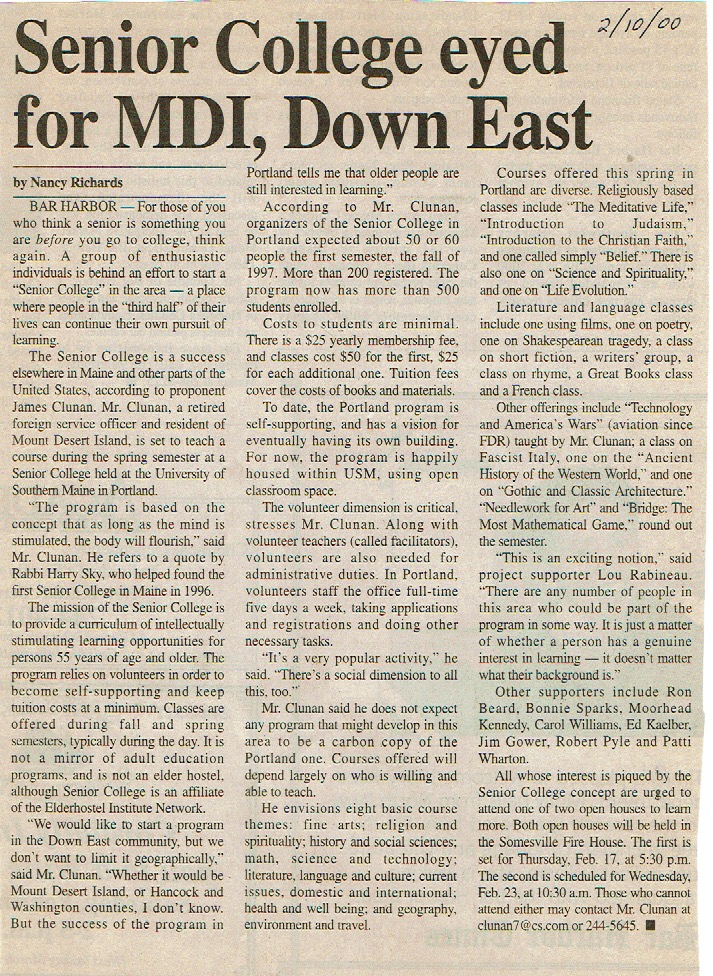 Senior College Eyed for MDI, DownEast by Nancy Richards - published in the Bar Harbor Times on February 10, 2000.
